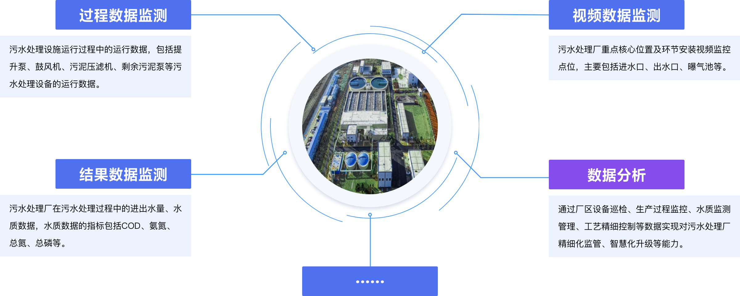 現目前中小型污水處理廠較多,分布位置較為分散,較多采用人工運維管理方式;所采用的工藝不盡相同,大部分污水處理廠因管網建設不完善,導致進水濃度降低、雨污混流、海水倒灌,進而間接影響整體運行。 本方案結合實際情況,采集污水處理廠(站)水質水量、工藝工況、視頻監控等監管數據,監管排水的水質水量工況、作業等環保及安全情況,與物聯網設備的無縫集成,實時、動態在線監測監控污水處理廠、污水處理站的情況,進行異常告警,建立動態、可視化、長效的監管機制。 適用對象:相關監管部門、各類污水處理廠。 解決的問題:提高工作效率和便利性;管理標準化,操作效率化;大數據統計分析,優化管理和運營;數據匯總收集,監管科學真實。 應用的價值:提升污水處理運營管理智能化水平,運維監管一體化。將工作環節實現與平臺銜接,解決以往系統建設后很難落地使用的問題。